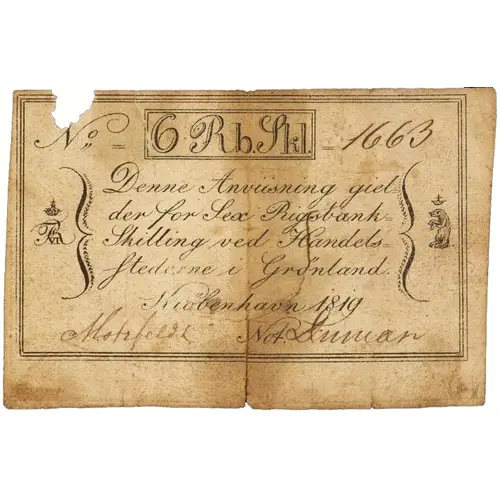 | Obverse lettering | 6 Rb.Skl. Denne Anviisning gielder for Sex Rigsbank Skilling ved Handelsſtederne i Grönland. Kiöbenhavn, 1819 (Translation: 6 Rigsbankskilling This note is valid for six Rigsbankskilling at the Trading Posts in Greenland. Copenhagen, 1819) |