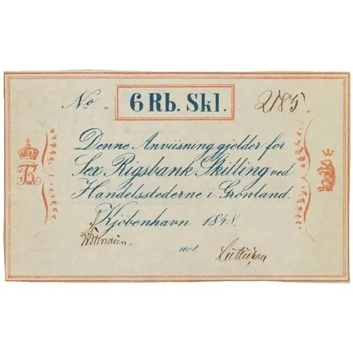 | Obverse lettering | 6 Rb.Skl. Denne Anviisning gjelder for Sex Rigsbank Skilling ved Handelsstederne i Grönland. Kjöbenhavn, 1848 (Translation: 6 Rigsbankskilling This note is valid for six Rigsbankskilling at the Trading Posts in Greenland. Copenhagen, 1848) |