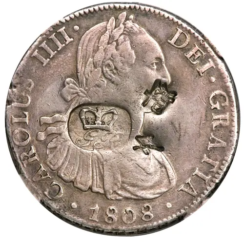 GR CAROLUS·IIII·DEI·GRATIA ·1808· (Translation: King George. Charles the 4th by the grace of God.) |