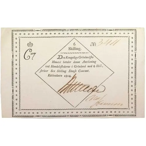 | Obverse lettering | 6 Skilling. Den Kongelige Grönlandſke Handel betaler denne Anviisning ved Handelsſtederne i Grönland med 6 Skill., ſkriver Sex Skilling Danſk Courant. Kiöbenhavn 1804. (Translation: 6 Skilling. The Royal Greenlandic Trading will pay this note the the trading posts in Greenland with 6 Skilling, written six Skilling Danish Courant. Copenhagen 1804) |