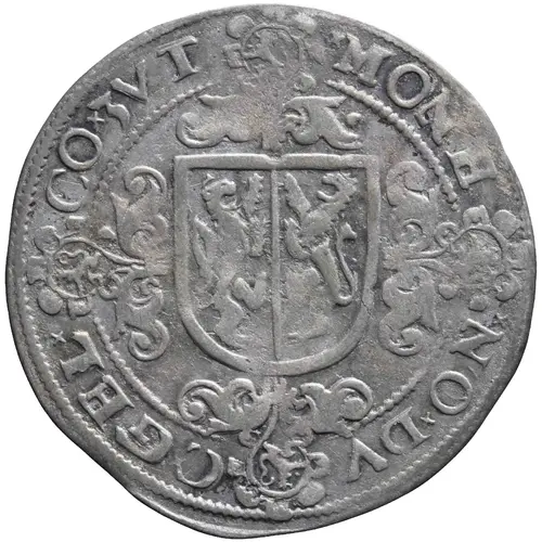 × MONE × NO × DVC × GEL × CO × ZVT (Translation: New coinage of the Duchy of Gelderland and County of Zutphen) |
