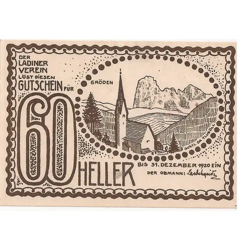 | Obverse lettering | GRÖDEN GUSTL DA TLUSÖLL DER LADINER VEREIN LÖST DIESEN GUTSCHEIN FÜR 60 HELLER BIS 31. DEZEMBER 1920 EIN DER OBMANN: (?) |