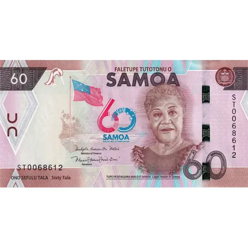 Obverse lettering FALETUPE TUTOTONU O SAMOA 60 SAMOA FOLAU MA LE FAATUATUA ONO SEFULU TALA Sixty Tala TUPE FAʻATAGAINA-MALO O SAMOA Legal Tender in Samoa