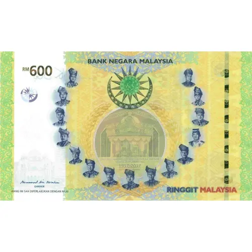 The reverse design features the portraits of the nine rulers signing the Federation of Malaya Independence Agreement on 5 August 1957. These banknotes are decorated with prominent independence and post-independence figures and features. On the right-hand side of the banknote is the triumphant silhouette of Tunku Abdul Rahman Putra Al-Haj, the architect of Malayan independence and the first Prime Minister of Malaysia. Imprinted on the background are four significant landmarks: the National Palace, Perdana Putra, the Parliament building and the Palace of Justice. These reflect the four pillars of the nation: the institution of the Monarchy, the Executive, the Legislature and the Judiciary respectively. |