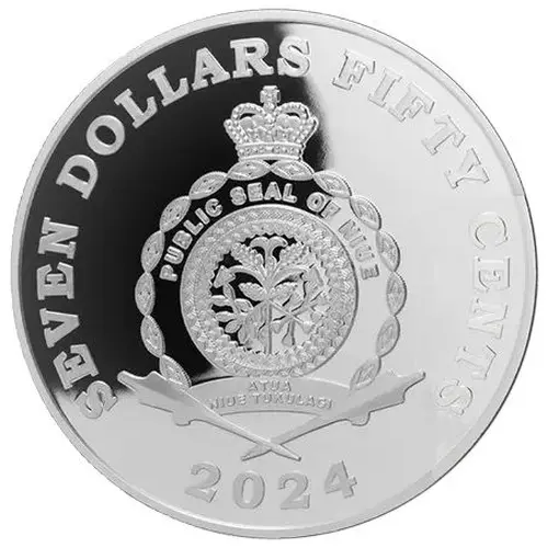 | Obverse lettering | SEVEN DOLLARS FIFTY CENTS PUBLIC SEAL OF NIUE ATUA NIUE TUKULAGI 2024 |
