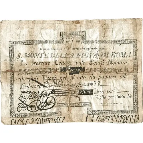 | Obverse lettering | 7 QUINDICI NOVEMBRE MILLE SETTECENTOOTT ANTACINQUE S. M. DI PIETA DI ROMA La presente Cedola vaglia Scudi Romani Sette da giulj dieci per Scudo da pagarsi all` Esibitore. |