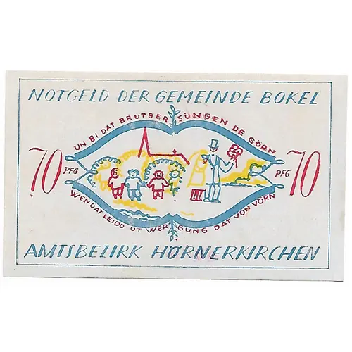 NOTGELD DER GEMEINDE BOKEL 70 PFG AMTSBEZIRK HORNERKIRCHEN (Translation: Notgeld of the community Bokel 70 Pfennig Official District Hornerkirchen) |