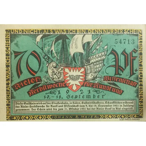 | 正面铭文 | NIMM MICH ALS WAS ICH SCHEINE UND NICHT ALS WAS ICH BIN. DENN NUR DER SCHEIN ALLEINE HAT HUETE EINEN SINN 54713 70 Pf. Kieler Herbstwoche für Kunst und Wissenschaft Dieser Gutschein wird auf der Straßenbahn, in Läden, Gastwirtschaften u. Schankstätten während der Kieler Herbstwoche für Kunst und Wissenschaft vom 9. bis 19. September 1921 in Zahlung genommen. Der Schein wird bis zum 31. Oktober 1921 bei der Kieler Bank in Kiel eingelöst. IOHANN B, MAIER, |