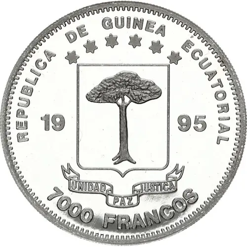 | Obverse lettering | REPUBLICA DE GUINEA ECUATORIAL 1995 UNIDAD PAZ JUSTICIA 7000 FRANCOS (Translation: Republic of Equatorial Guinea Unity Peace Justice) |