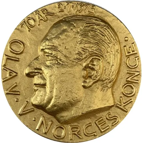 | Obverse lettering | OLAV . V . NORGES KONGE . 70 ÅR 2.7.1973 |