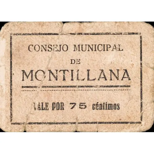 CONSEJO MUNICIPAL DE MONTILLANA VALE POR 75 céntimos (Translation: Municipal Council of Montillana Valid for 75 Centimos) |