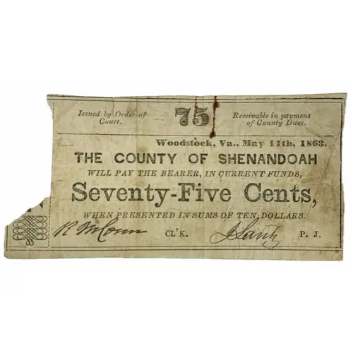 | Obverse lettering | Issued by Order of Court. 75 Receivable in payment of County Dues. Woodstock, Va., May 11th, 1863. THE COUNTY OF SHENANDOAH WILL PAY THE BEARER, IN CURRENT FUNDS, Seventy-Five Cents WHEN PRESENTED IN SUMS OF TEN DOLLARS. CL’K P. J, |