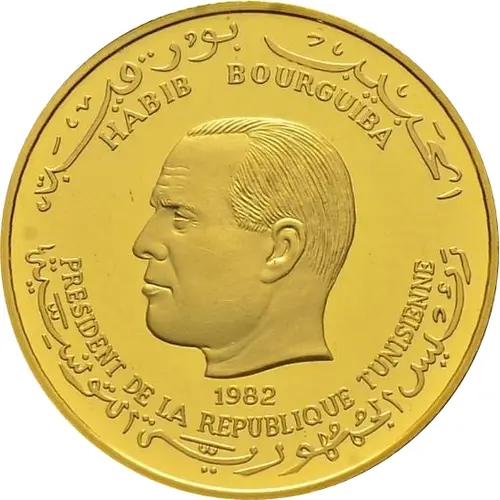 | Legenda del dritto | HABIB BOURGUIBA 1982 PRESIDENT DE LA REPUBLIQUE TUNISIENNE رئيس الجمهورية التونسية (Translation: Habib Bourguiba 1982 President of the Tunisian Republic) |
