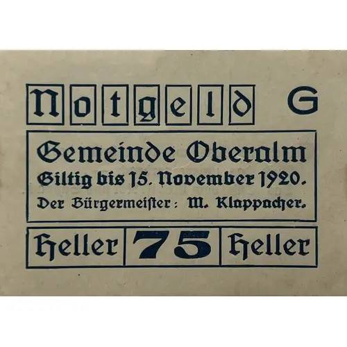 Obverse lettering Notgeld G Gemeinde Oberalm Giltig bis 15. November 1920. Der Bürgermeister: M. Klappacher. Heller 75 Heller