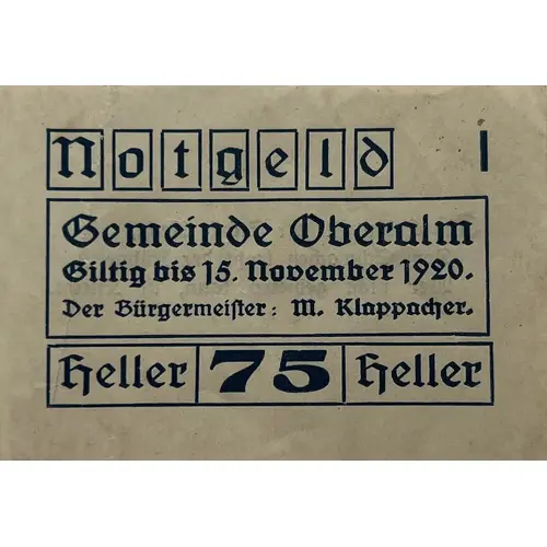 | Obverse lettering | Notgeld I Gemeinde Oberalm Giltig bis 15. November 1920. Der Bürgermeister: M. Klappacher. Heller 75 Heller |