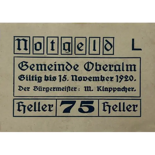 | Obverse lettering | Notgeld L Gemeinde Oberalm Giltig bis 15. November 1920. Der Bürgermeister: M. Klappacher. Heller 75 Heller |