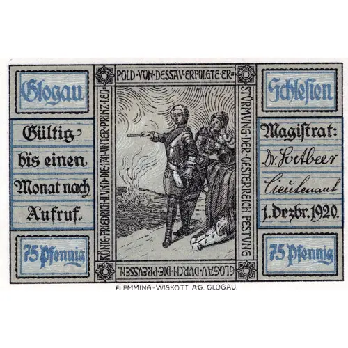 | Leyenda del anverso | Glogau Schlesien Gültig bis einen Monat nach Aufruf. Magistrat: Dr. Svetbeer Lieutenant 1. Dezbr. 1920. 75 Pfennig KÖNIG ◦ FRIEDRICH ◦ II. ◦ UND ◦ DIE ◦ 1741 ◦ UNTER ◦ PRINZ ◦ LEO- POLD ◦ VON ◦ DESSAU ◦ ERFOLGTE ◦ ER- STÜRMUNG ◦ DER ◦ OESTERREICH. FESTUNG GLOGAU ◦ DURCH ◦ DIE ◦ PREUSSEN. FLEMMING – WISKOTT A · G, GLOGAU. |