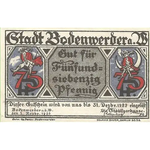 Légende de l’avers STADT BODENWERDER 75 pfennig Diefer Gutschein wird von uns bis 31 Dezbr . 1922 Bodenwerder den 1 . novbr .1920