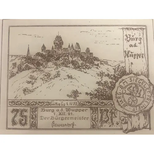 | Obverse lettering | Burg a.d.Wüpper BUR B.M.SIEGEL ET FREIHEIT Burg a.d.Wüpper 1.XII.1921 Der Bürgermeister |