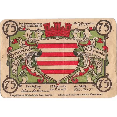 | Descrizione del dritto | 75 pfennig gemeinde Noschenrode. Ausgefurth in Klischeefabrik Harzer Graphia |