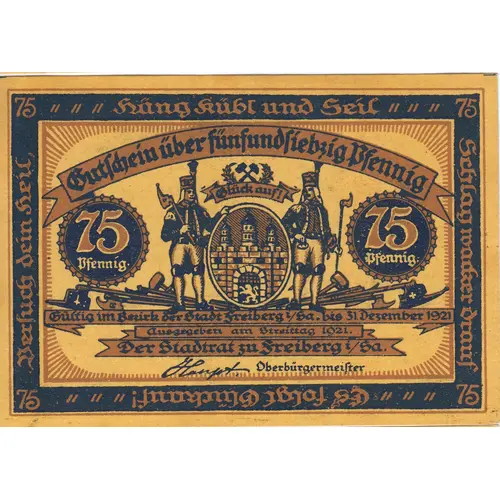 border text: Versuch dein heil, häng kübl und Seil Schlag wacker drauf Es folgt Glück auf! text inside the border: Gutschein über fünfundsiebzig Pfennig 75 pfennig. Glück auf! 75 pfennig. Gültig im Bezirk der Stadt Freiberg i/Sa. bis 31. Dezember 1921 Ausgegeben am Streittag 1921 Der Stadtrat zu Freiberg i/Sa. (Translation: border text: Try (strain) your health, |