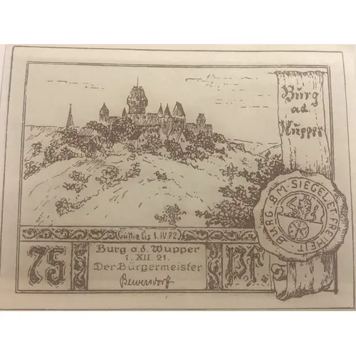 | Obverse lettering | Burg a.d.Wüpper BURG B.M.SIEGEL ET FREIHEIT Burg a.d.Wüpper 1.XII.1921 Der Bürgermeister 75 Pf |
