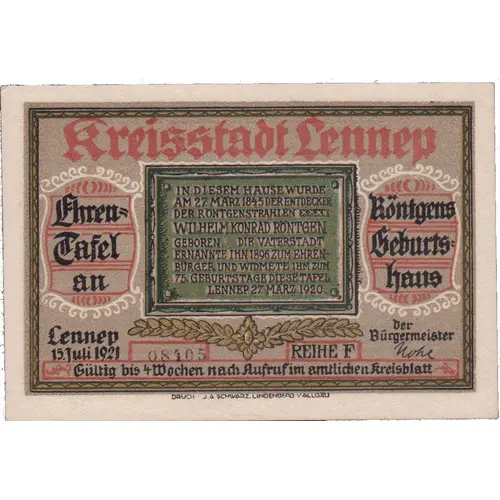 Obverse description Green rectangle at center telling that this is the house where Wilhelm Konrad Röntgen was born on 27. March 1845