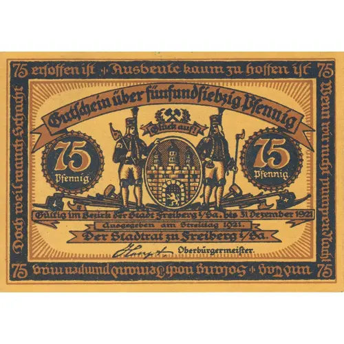 border text: Solang noch Jemand pumpen mag Doch weil manch Schacht ersoffen ist. Ausbeute kaum zu hoffen ist Wenn wir nicht pumpen Nacht und Tag. text inside the border: Gutschein über fünfundsiebzig Pfennig 75 pfennig. Glück auf! 75 pfennig. Gültig im Bezirk der Stadt Freiberg i/Sa. bis 31. Dezember 1921 Ausgegeben am Streittag 1921 Der Stadtrat zu Freiberg i/Sa. (Translation: border text: As long as someone will still pump - even though many a shaft is exhausted. Yield is hardly to be hoped for if we don`t pump night and day. text inside the border: Voucher for 75 pfennig 75 pfennig Good luck! 75 pfennig Valid in the district of the City of Freiberg in Sachsen until the 31st of December 1921 Issued on the day of the dispute 1921 The City Council of Freiberg in Sachsen |