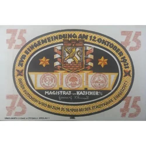 | Obverse lettering | 75 75 ZVR EINGEMEINDUNG AM 12. OKTOBER 1921 MAGISTRAT VON KATSCHER DIESER GUTSCHEIN WIRD BIS ZUM 31.12.1922 BEI DER STADKASSE EINGELÖST! MOL 75 75 GRASS.BARTH & COMP. W. FRIEDRICH BRESLAU .I |