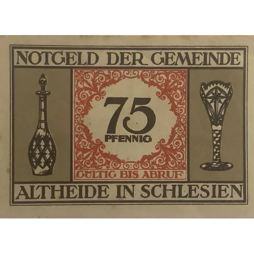 | Legenda awersu | NOTGELD DER GEMEINDE 75 PFENNIG GÜLTIG BIS ABRUF ALTHEIDE IN SCHLESIEN |