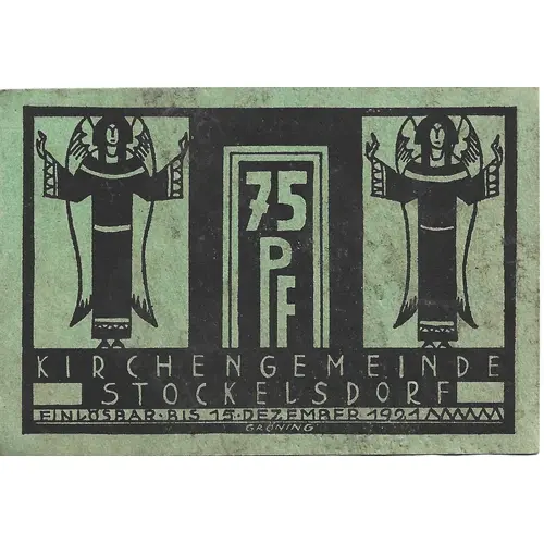 Obverse lettering 75 PF KIRCHENGEMEINDE STOELSDORF EINLÖSBAR · BIS 15 · DEZEMBER 1921 GRÖNING