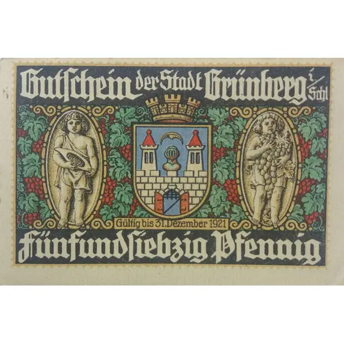 | Legenda awersu | Gutschein der Stadt Grünberg i. Schl Gültig bis 31.Dezember 1921 fünfundsiebzig Pfennig |