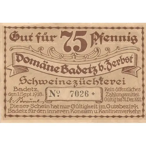 | Opis líce | Gur für 75 Pfennig Domäne Badetz b. Zerbst Schweinezüchterei Badetz, den 1.Sept.1918. No 7026 Kein öffentliches Zahlungsmittel. Gültig bis 31.Dez.1921. Dieser Schein hat nur Gültigkeit im Gutsbezirk Badetz für den inneren Konsum u. Kantinenverkehr. (Translation: 75 Pfg. Hier seht ihr auf den ersten Blick Ein richtiggehendes `Schweineglück` Acht Ferkel saugen voller Luft An ihrer lieben Mutterbrust! Warum sie`s tun? ich möchte wetten: Nur um das Vaterland zu retten -. 75 Pfg) |