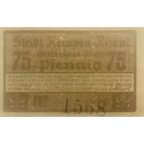 Stadt Kempen-Rhein Gutschein über 20 Pfennig 20 DIESER GUTSCHEIN WIRD VON ALLEN STÄDT KASSENSCHEINS IN ZAHLUNG GENOMMEN ER VERLIERT SEINE GÜLTIGKEIT EINEN MONAT NACH AUFKÜNDIGUNG IN DEN KEMP.ORTSBLATTERN.DIE STADTGEMEINDE KEMPEN HAFTET FÜR DIE EINLÖSUNG. KEMPEN RHEIN.9.3.20 DER BÜRGERMEISTER |