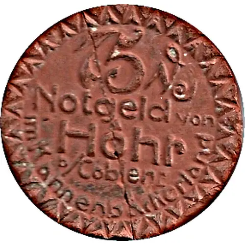 | Obverse lettering | 75 Pf. Notgeld von Höhr b/ Coblenz im Kannenbäckerland |