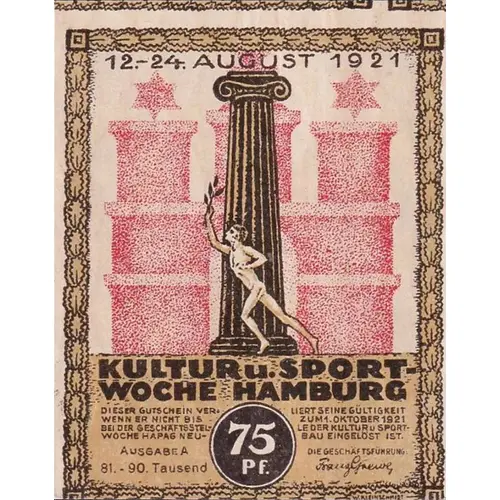 | Obverse lettering | 12-24-AUGUST 1921 KULTURU. SPORT WOCHE HAMBURG 75 PF AUSGABE B |