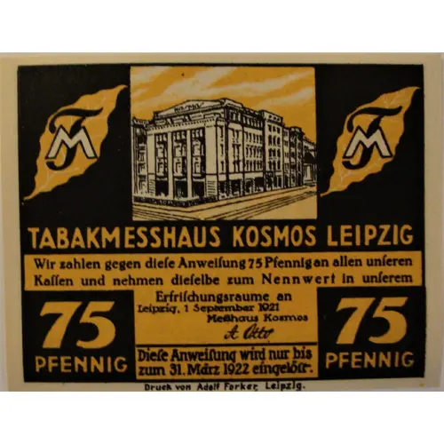 | Obverse lettering | tabakmesshaus kosmos Leipzig 75 pfennig |