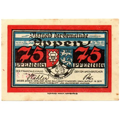 | Obverse lettering | Notgeld der Gemeinde Appen 75 Pfennig 75 Pfennig COM. AMTSBEZIRK PINNEBERG DER FINANZAUSSCHUSS I.A. DER COM. AMTSVORTEHER DIESER SCHEIN VERLIERT SEINE GÜLTIGKEIT 2 WOCHEN NACH AUFRUF IN DEN PINNEBERGER TAGEBLATT UND LOCKSTEDTER ANZEIGER KONRAD HANF, HAMBURG 8 |