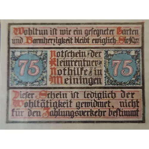 Wohltun ist wie ein gesegneter Garten und Barmherzigkeit bleibt ewiglich Sir40,17 Notschein der Kleiurenturr Nothilfe in Meiningen Dieser Schein ist lediglich der Wohltatigkeit gewidmet, nicht fur den Zahlungsverkehr bestimmt (Translation: Doing good is like a blessed garden and mercy abides forever Sir 40:17 Emergency certificate of the Clothing no Emergency aid in Meiningen This appearance is just that Dedicated to charity, not intended for payment transactions) |
