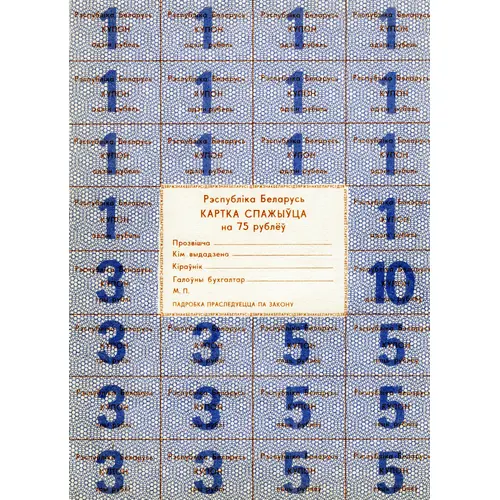 | Obverse lettering | Рэспубліка Беларусь КАРТКА СПАЖЫЎЦА на 75 рублёў Прозвішча __________ Кім выдадзена __________ Кіраўнік __________ Галоўны бухгалтар __________ М. П. ПАДРОБКА ПРАСЛЕДУЕЦЦА ПА ЗАКОНУ (Translation: Republic of Belarus, Consumer card for 75 Rubles, Last name/Issuing authority/Administrator/Chief accountant, Counterfeit is prosecuted by law) |