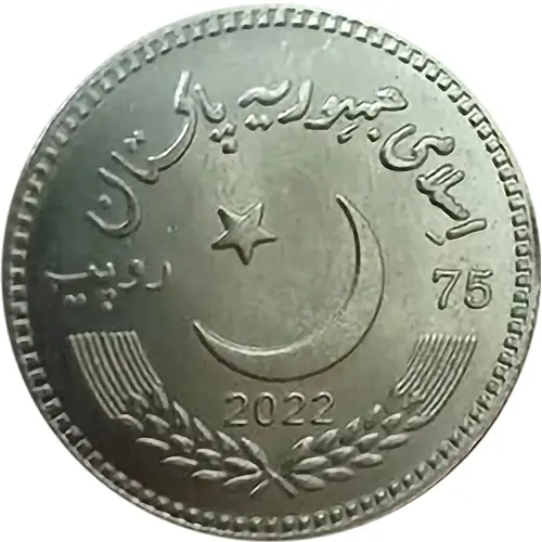 The waxing crescent moon and five-pointed star facing North West in rising position is in the center. Wording `اسلامی جمہوریہ پاکستان` in Urdu script on top. Below the crescent and at the top of two springs of wheat with arms curved upward. Year 2022 above the wheat springs. The face value of the coin in numeral “75” in bold letters and `RUPIA`, `روپیہ` in Urdu script are written on the right and left sides of the crescent star respectively. |