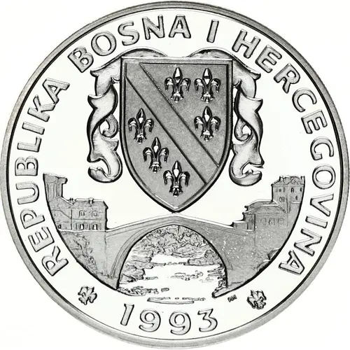 | Descrizione del dritto | Bosnian national emblem above Mostar Bridge. Mintmark below bridge & right of the date. |