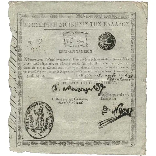 ΠΡΟΣΩΡΙΝΗ ΔΙΟΙΚΗΣΙΣ ΤΗΣ ΕΛΛΑΔΟΣ ΕΘΝΙΚΟΝ ΤΑΜΕΙΟΝ Χρεωϛοῦνται Γρόσια Επτακόσια πενῆντα μὲ τόκον ἐτήσιον ὀτκὼ τὰ ἑκατὸν διδόμενον κατὰ ἑξαμηνίαν, καὶ ἐξιφλοῦνται εἰς ἔτη τρία. Η παροῦσα ὁμολογία εἶναι δεκτὴ εἰς ἀγορὰν ἐθνικῶν κτημάτων· προτιμᾶται ἀπὸ μετρητά· εἶναι δεκτὴ καὶ εἰς τὰ συναλλάγματα, κατὰ τὸν Νόμον τὸν ἐκδοθέντα ἐν Επιδαύρῳ τὴν ιή. Ιαννουαρίου ͵αωκβ. Αρ. α. Εν Κορίνθῳ τὴν __ __ 1822. Ο ΠΡΟΕΔΡΟΣ ΤΟΥ ΕΚΤΕΛΕΣΤΙΚΟΥ. Ο Αρχιγραμματεὺς τῆς Επικρατείας. Ο Μινίϛρος τῆς Οἰκονομίας ΜΙΝΙΣΤΕΡΙΟΝ ΤΗΣ ΟΙΚΟΝΟΜΙΑΣ (Translation: Provisional Administration of Greece National Treasury The debt due is Seven Hundred and Fifty Grosia, with interest at the rate of one hundred eight percent per annum, payable semi-annually, and redeemable in three years. The present bond is acceptable for the purchase of national property; it is preferable to cash; it is also acceptable for foreign exchange, according to the Law issued in Epidaurus on January 1822 No. 1. In Corinth on __ __ 1822. The President of the Executive (signature of Alexandros Mavrokordatos) The Chief Secretary of State. (signature of Panoutsos Notaras) The Minister of Finance (signature of Theodoros Negris) Ministry of Economy) |