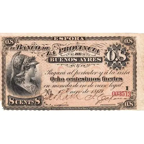 ESPORA EL BANCO DE LA PROVINCIA DE BUENOS AYRES Pagará al portador y á la vista Ocho centesimos fuertes En moneda de curso legal 1º de Enero de 1869 8 Cents 8 (Translation: ESPORA The Bank of the Province of Buenos Aires Wil pay to the bearer and at sight Eight Centesimos Fuertes in legal tender currency January 1st., 1869 8 Cents. 8) |