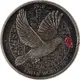 Flying dove with poppy in beak in front of the word peace in several fonts and year above. |