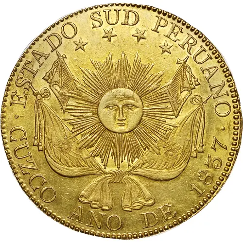 Obverse lettering ESTADO SUD PERUANO . CUZCO ANO DE 1837 .