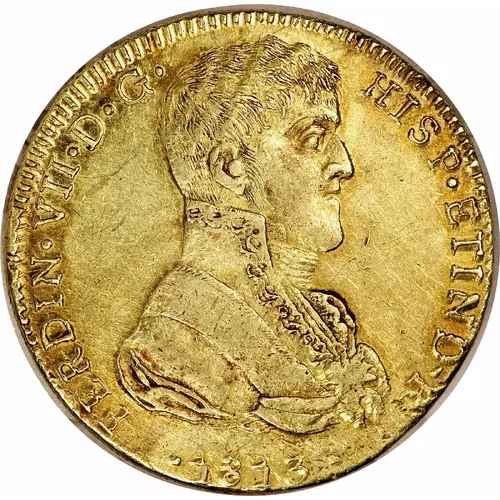 Technical/Grading: For optimal grading, collectors should prioritize strong strikes, particularly on the central elements of both obverse and reverse. Key high-points include the intricate details of Fernando VII's hair and uniform on the obverse, and the crown, shield elements (castles, lions), and chain of the Golden Fleece on the reverse. Legibility of the date and assayer's initials is paramount. Due to the wartime production, planchet quality can vary, with some examples exhibiting adjustment marks or minor laminations. Original mint luster, though often subdued for gold, is highly desirable, as are fields free from excessive bag marks or abrasions, which are common given the softness of gold.