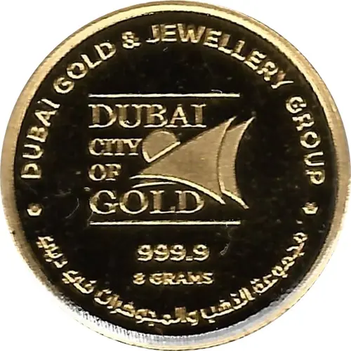 | Obverse lettering | DUBAI GOLD & JEWELLERY GROUP DUBAI CITY OF GOLD 999.9 8 GRAMS مجموعة الذهب والمجوهرات في دبي |