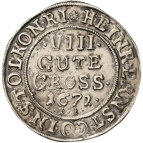 | Obverse lettering | .VIII. GUTE GROSS. 1671. .I.B. HEINR.ERNST.CO.IN.STOL.KON.RI |