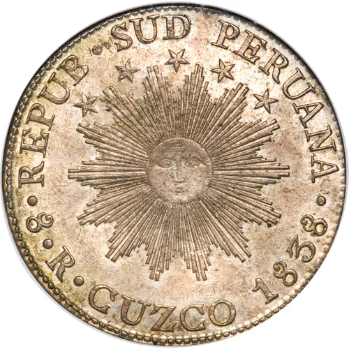 | Obverse lettering | · REPUB · SUD PERUANA · 8 · R · CUZCO 1838 |